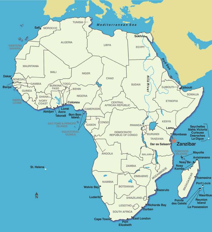 Look at the red star to find Zanzibar